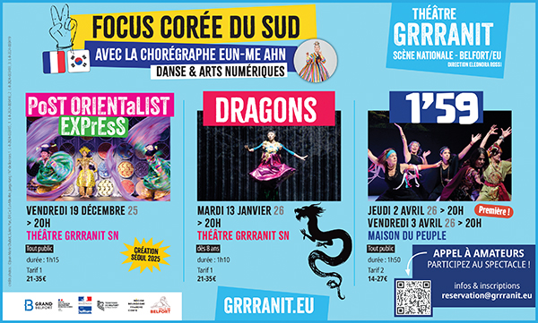Cette saison, l’une des thématiques du Théâtre GRRRANIT Scène nationale nous transporte en Corée du Sud, aux côtés de la chorégraphe Eun-Me Ahn. Trois occasions de découvrir son univers avec Post Orientalist Express, Dragons et enfin 1’59, qui mobilisera en avril 50 danseurs amateurs, entre chorégraphie et théâtre.