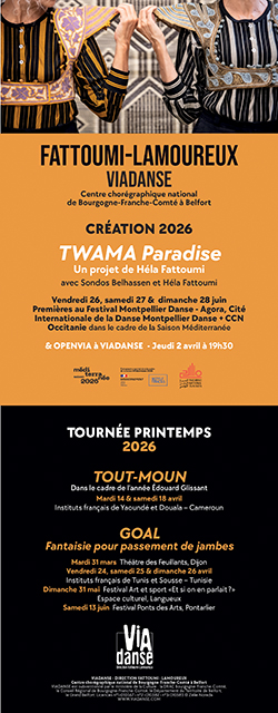 VIADANSE proposera le 2 avril un Openvia dédié à la nouvelle création d’Héla Fattoumi, TWAMA Paradise. Si la première se tiendra fin juin au Festival Montpellier Danse 2026, le public de l’Aire urbaine aura la primeur de ce voyage en binôme qu’ont décidé d’accomplir Héla Fattoumi et Sondos Belhassen.