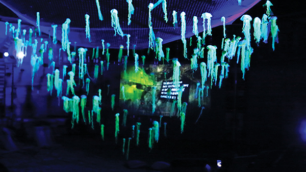 La compagnie d’art en espace public, originaire de Marseille, n’est pas une nouvelle venue à Chalon-sur-Saône. On a pu découvrir ses installations vivantes lors des deux dernières éditions de Chalon dans la rue. À l’été 2024, l’installation En Vol se déployait sur une quinzaine de lieux du territoire chalonnais : hôpital, tribunal, gare… « En Vol ça parle de résistance, d’histoire de résistance, de grandes oiselles fluorescentes que vous avez peut-être croisées dans l’espace public à différents endroits”, explique Maëva Longvert. La nouvelle création du Polymorphe, Scélérates, a donc connu une première forme l’été dernier, prélude (déjà élaboré de manière collective avec la population chalonnaise) qui mêlait installation textile, sonore et vidéo autour de la montée des eaux inspirée du mythe de Médusa. Un plafond de près de 250 méduses accueillait le public. “Elles nous racontent une histoire autour de la montée des eaux”, explique Pépita Car. “Il y a aussi de la vidéo qu’on a tournée sous l’eau, difficile à décrire parce qu’il y a plein de choses qui apparaissent !”. Scélérate, c’est l’adjectif que l’on attribue à une grande vague, un mur d’eau qui s’élève en pleine mer. “On questionne les gens sur aujourd’hui : qu’est-ce qu’ils ont envie de voir disparaître pour que les choses changent ? Comment ils ont envie de rentrer et dessiner ensemble des futurs désirables.”