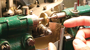 Dans son atelier, on trouve ses réalisations mais aussi de nombreuses machines, outils divers ainsi qu’une bibliothèque bien fournie. Ce qui l’intéresse : “fabriquer quasiment tout de A à Z, de l’idée jusqu’à l’œuvre terminée”. John-Mikaël s’enthousiasme autant pour ses créations que pour les outillages qui lui ont permis de les réaliser… Lorsqu’il se met à son compte, l’artisan acquiert le matériel d’un horloger à la retraite. Au fil du temps, son outillage s’est étoffé, et il remet en usage des outils parfois très anciens, qui lui permettent d’être autonome et fabriquer ses propres pièces. Il nous présente ainsi une machine à tailler, vieille dame allemande, centenaire mais encore vaillante, grâce à laquelle John-Mikaël Flaux fabrique ses roues dentées en petites quantités. Il n’est pas peu fier de nous montrer quelques vieux ouvrages glanés sur des brocantes, des mines d’or à l’image de ce petit livre logiquement intitulé L’horloger de Christian Poncet (1938). “On voit bien qu’à l’époque, ils étaient à la recherche constante de petites innovations qu’ils allaient appliquer à l’atelier, qui allaient leur permettre de gagner beaucoup de temps, répondre à des problèmes, plutôt que d’avoir une solution standard toute faite.”