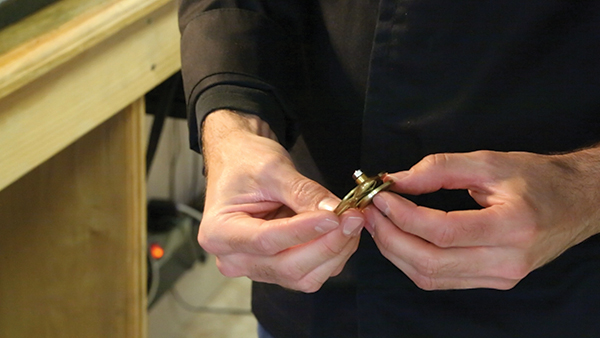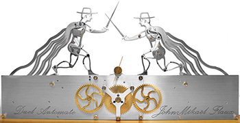 D’ailleurs le logo de John-Mikaël Flaux est une clé qui symbolise “la vie qu’on va insuffler à l’automate à travers son poids moteur ou son ressort”. Une clé pour incarner ce mouvement après lequel courent tous les horlogers. “Ce qui est passionnant avec les automates, c’est que ce sont avant tout des objets d’exception qui fonctionnent sans autre source d’énergie. Ce sont des machines à poésie.” Pour ses automates comme le cheval cabré ou le duel à l’épée, le créateur a dû tout d’abord observer, avant de nous offrir sa vision toute personnelle de ces modèles. “Il y avait un travail extrêmement difficile sur la morphologie du cheval, pour la réinterpréter avec ces pièces en bronze patiné que j’ai réalisées.” La pièce la plus complexe pour l’artisan, de son propre aveu.