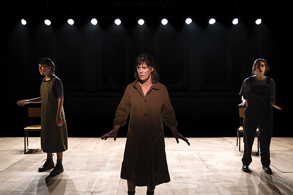 Au début le désir était que ce soit le minimum possible, du théâtre de tréteaux, dans le sens où ce dont on a besoin, c’est de trois comédiennes, du texte et du public pour l’entendre. C’était suffisant car L’Arbre à sang évoquait suffisamment d’images, par la parole, par la voix, pour ne pas avoir de décor. Pour la re-création en salle, j’ai redessiné un espace, qui est complètement abstrait, ne représente rien du tout, pour essayer de recréer de la proximité entre les publics et le plateau.
