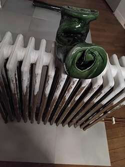 « Universal Sleep« est une exposition de l’artiste Allemande Katinka qui a souhaité jouer la carte de l’intimiste, en fermant les volets de la galerie : des lumières tamisées illuminent des céramiques froides émaillées en vert posées sur des radiateurs chauds! Quel paradoxe ! Avec tantôt des photographies en noir et blanc représentant le « care », « le soin de soi », tantôt une aiguille gigantesque installée sur un grand trombone provoquant la question de la force au lieu de la fragilité…
