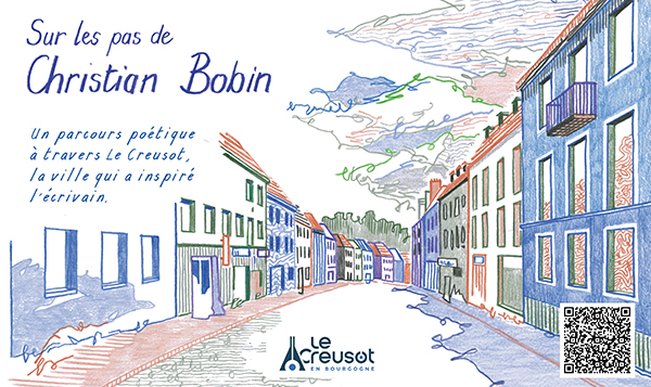 Ce nouveau circuit se veut immersif et interactif, et pour partir “Sur les pas de Christian Bobin”, le dispositif mêle installations visuelles et numériques. Le principe de base est une plaque avec une citation de Christian Bobin ou une illustration de Colin Gravot. En suivant ce parcours avec un téléphone, des QR Codes donnent accès aux mots de l’auteur, des extraits (à lire et/ou écouter selon les endroits), choisis pour faire résonner la poésie de Christian Bobin dans les rues creusotines. Des enregistrements audio permettront également d’en apprendre plus sur les liens entre l’auteur et Le Creusot. Ce contenu multimédia a été conçu par Cécile Fromont, directrice de l’association Hors Limites 71. Un livret de déambulation (non obligatoire) peut être acheté pour accompagner et compléter le parcours.