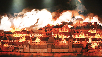L’incendie dura deux jours, occasionnant des dégâts considérables sur un tiers de la ville, laissant 726 familles sans-abris, et plus de 400 maisons détruites. L’exposition évoque également l’après: déblaiements, reconstructions… Suite à cet incendie, la ville de Salins-les-Bains ne serait plus jamais la même, son aspect ayant fortement changé. Sa physionomie médiévale a laissé la place à un paysage urbain plus moderne. Le fait que les maisons aient été construites très proches les unes des autres a contribué à cet embrasement spectaculaire de juillet 1825. La forte présence du bois sur les tavaillons, les balcons et les colombages, a également aidé à propager le feu. La bise qui soufflait très fort ce jour-là a achevé de faire de cet incendie, qui a probablement commencé dans une cheminée, l’une des catastrophes les plus importantes du XIX siècle en France.